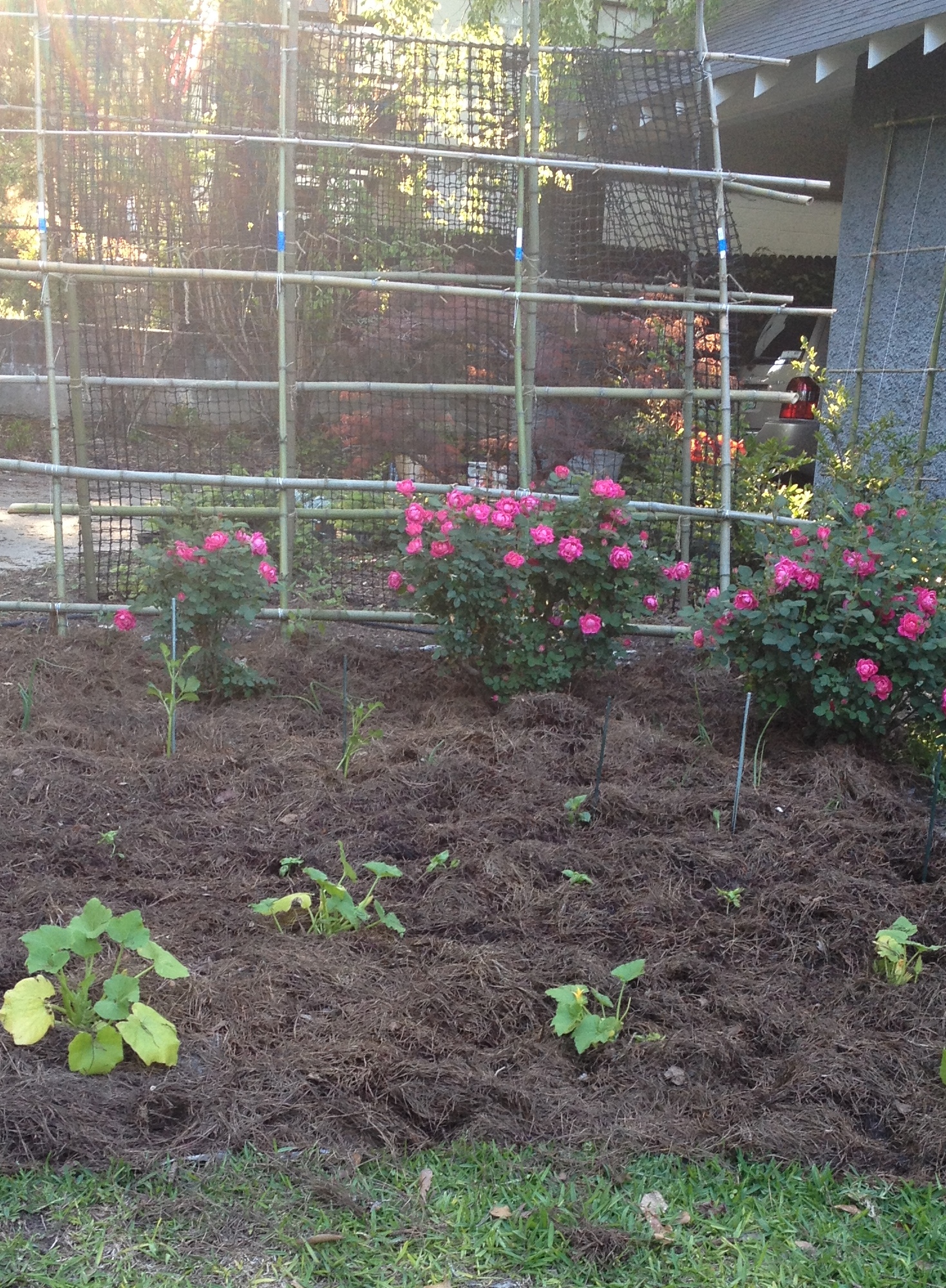 After I admired the flowers, I had to get to work. There was a lot to do! I spent most of yesterday afternoon pulling up pansies (and weeds) to make way for summer annuals. Today, I finally trimmed back the tea olive (I hated to cut them while they were blooming, so I just now got around to this task). Then I planted some zucchini and basil. Right. In. The. Front. Yard. Yes, people, I am a rebel. I figured 1) I’ve already got the tomato teepee, so I’m not destroying any fancy aesthetic by adding more veggies; 2) zucchini and basil are pretty; 3) there aren’t any draconian anti-vegetable restrictive covenants in my neighborhood (as far as I know); and 4) I was out of room in the raised beds.