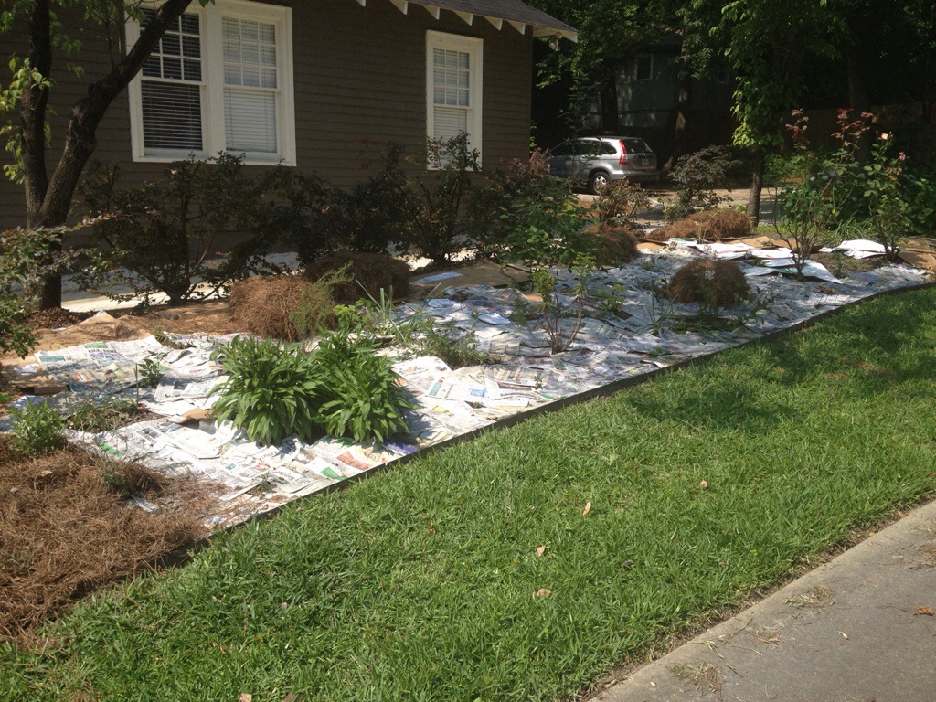 A couple of pointers. The Ledger-Enquirer is so thin that I just lay out a whole section at a time. I find that it’s helpful to have a hose handy, particularly on a windy day. After I lay a few sections of newspaper, I wet them so they don’t blow away. Also, after experimenting with several different methods, I’ve determined that the best method is to cover the bed in newspaper and pinestraw, THEN plant the plants. Here is the finished product: