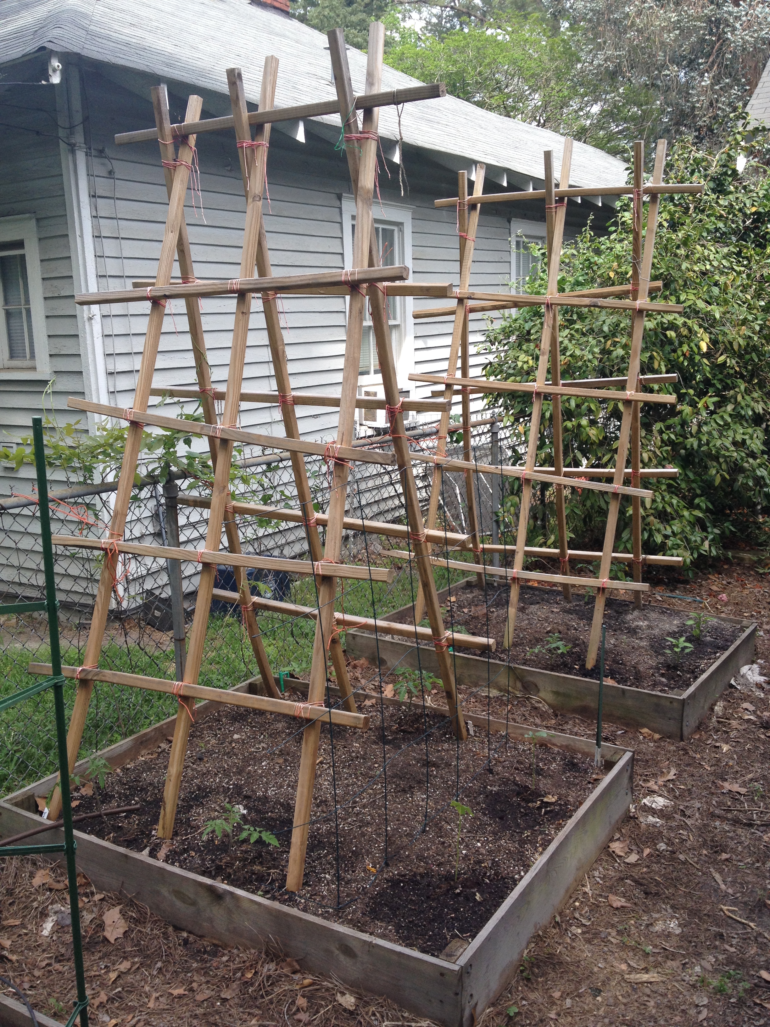 This year, I decided to build another ladder for tomatoes and possibly pumpkins. And I thought I’d take advantage of the southern side of my house, which gets good light. I was greatly inspired by the book Vertical Gardening by Derek Fell. It is an excellent book with many ideas (I’m still a little overwhelmed by all the options). The single most important piece of advice Mr. Fell gave: use bamboo to save money! Mr. Fell, you changed my life. Thank you. I do not have any bamboo on my tiny lot, so I asked my friends if they had any. Turns out a lot of folks have bamboo, and they’ll be happy to let you come cut it. My sweet friends Brooke and Brandon told me, “our bamboo is your bamboo,” so I’ve been up to their lovely bamboo forest twice, and I think I’m set for now. Note: harvesting bamboo is a pretty good workout. Make sure your loppers are sharpened before you attempt it!